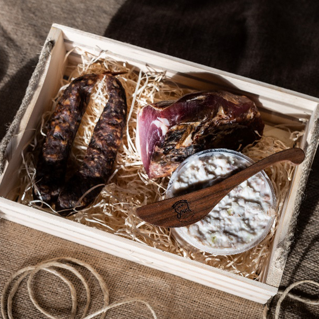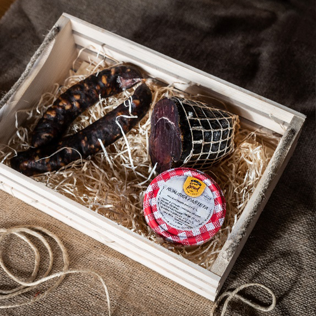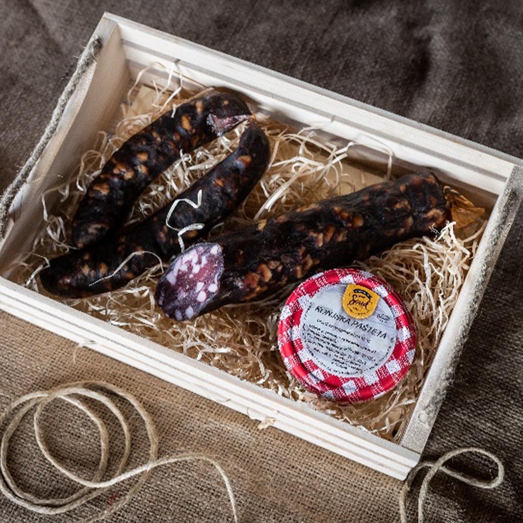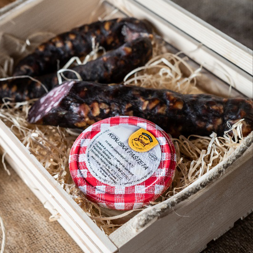 Konjska klobasa cca 250 g, konjski pršut cca 300 g, pašteta 230g.